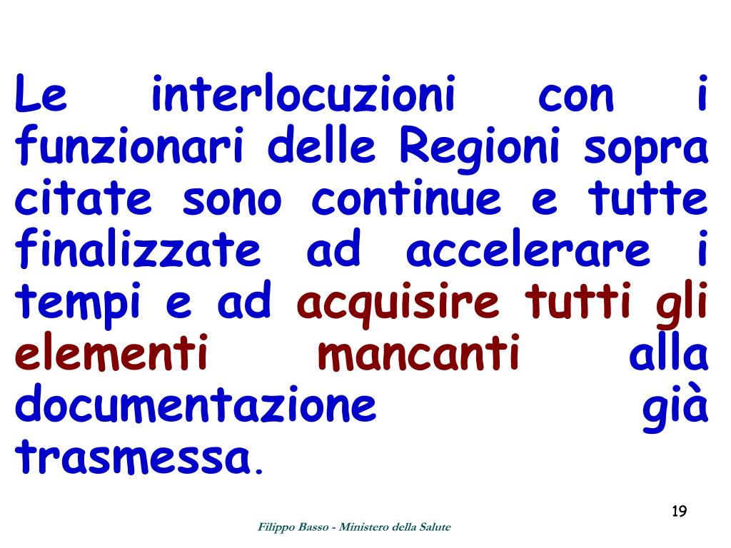 Le interlocuzioni con i funzionari delle Regioni sopra citate sono continue e tutte finalizzate ad accelerare i tempi e ad acquisire tutti gli elementi mancanti alla documentazione già trasmessa. 19 Filippo Basso - Ministero della Salute