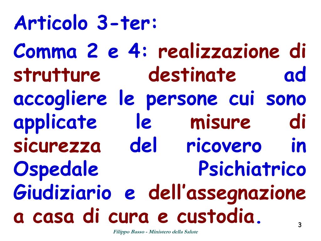 Articolo 3-ter: Comma 2 e 4: realizzazione di strutture destinate ad accogliere le persone cui sono applicate le misure di sicurezza del ricovero in Ospedale Psichiatrico Giudiziario e dell’assegnazione a casa di cura e custodia. 3 Filippo Basso - Ministero della Salute