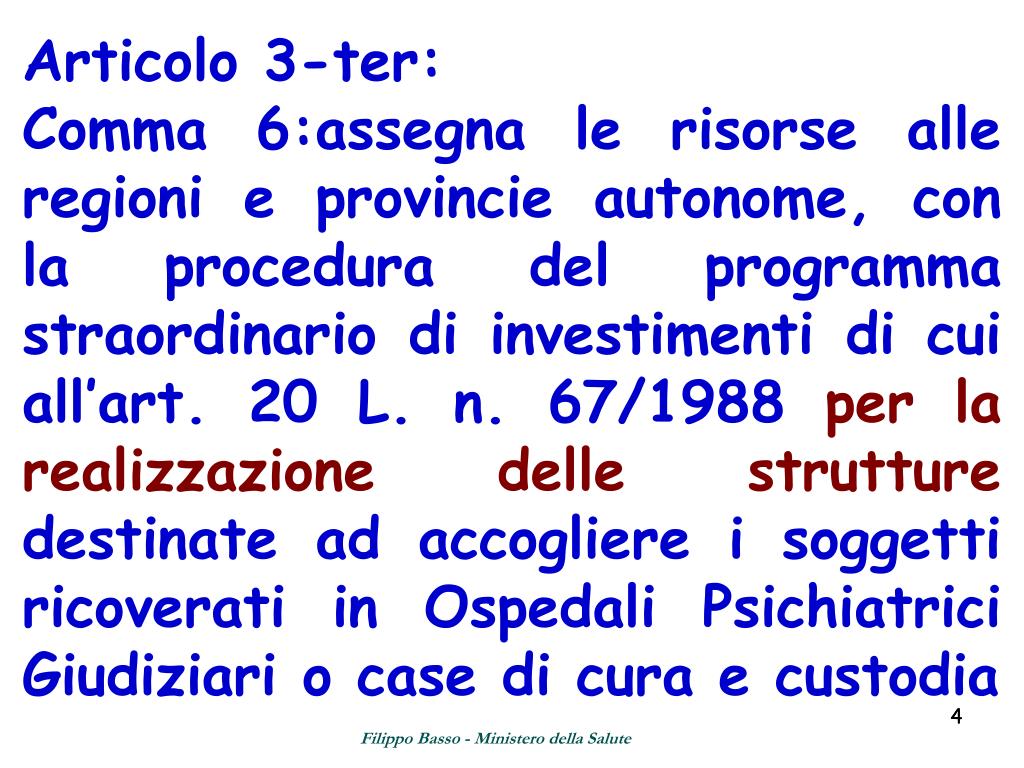 Articolo 3-ter: Comma 6:assegna le risorse alle regioni e provincie autonome, con la procedura del programma straordinario di investimenti di cui all’art. 20 L. n. 67/1988 per la realizzazione delle strutture destinate ad accogliere i soggetti ricoverati in Ospedali Psichiatrici Giudiziari o case di cura e custodia 4 Filippo Basso - Ministero della Salute