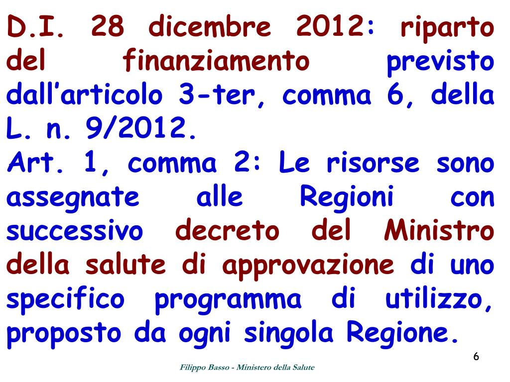 D.I. 28 dicembre 2012: riparto del finanziamento previsto dall’articolo 3-ter, comma 6, della L. n. 9/2012. Art. 1, comma 2: Le risorse sono assegnate alle Regioni con successivo decreto del Ministro della salute di approvazione di uno specifico programma di utilizzo, proposto da ogni singola Regione. 6 Filippo Basso - Ministero della Salute