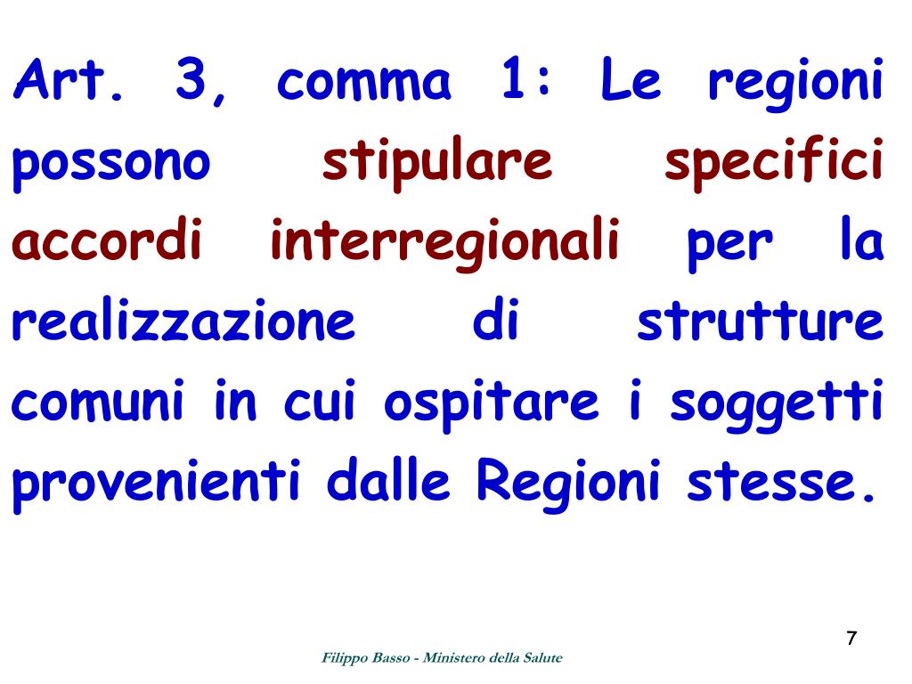 Art. 3, comma 1: Le regioni possono stipulare specifici accordi interregionali per la realizzazione di strutture comuni in cui ospitare i soggetti provenienti dalle Regioni stesse. 7 Filippo Basso - Ministero della Salute
