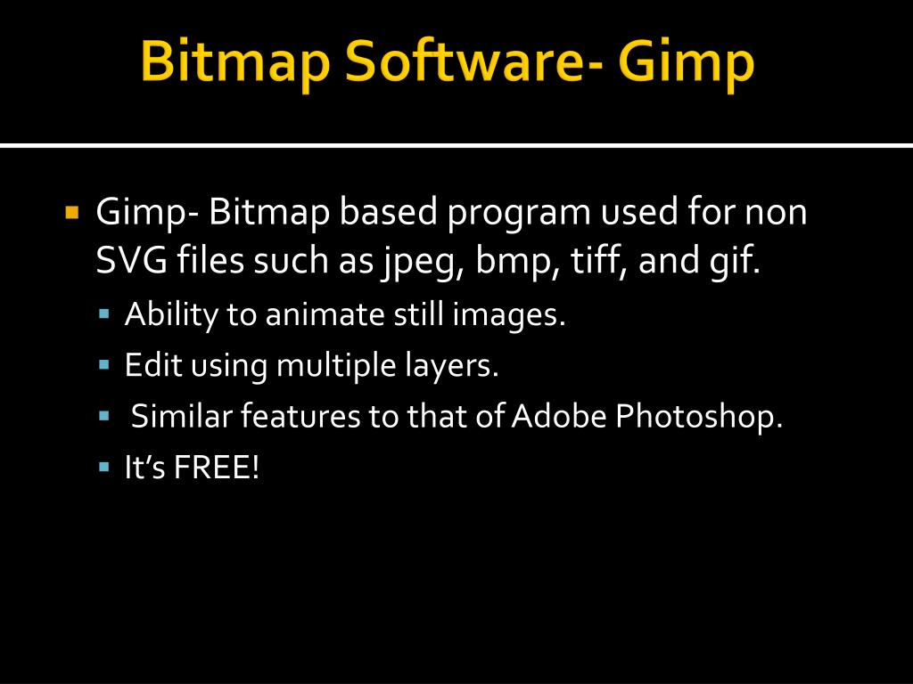 Bitmap Software- Gimp • Gimp- Bitmap based program used for non SVG files such as jpeg, bmp, tiff, and gif. • Ability to animate still images. • Edit using multiple layers. • Similar features to that of Adobe Photoshop. • It’s FREE!