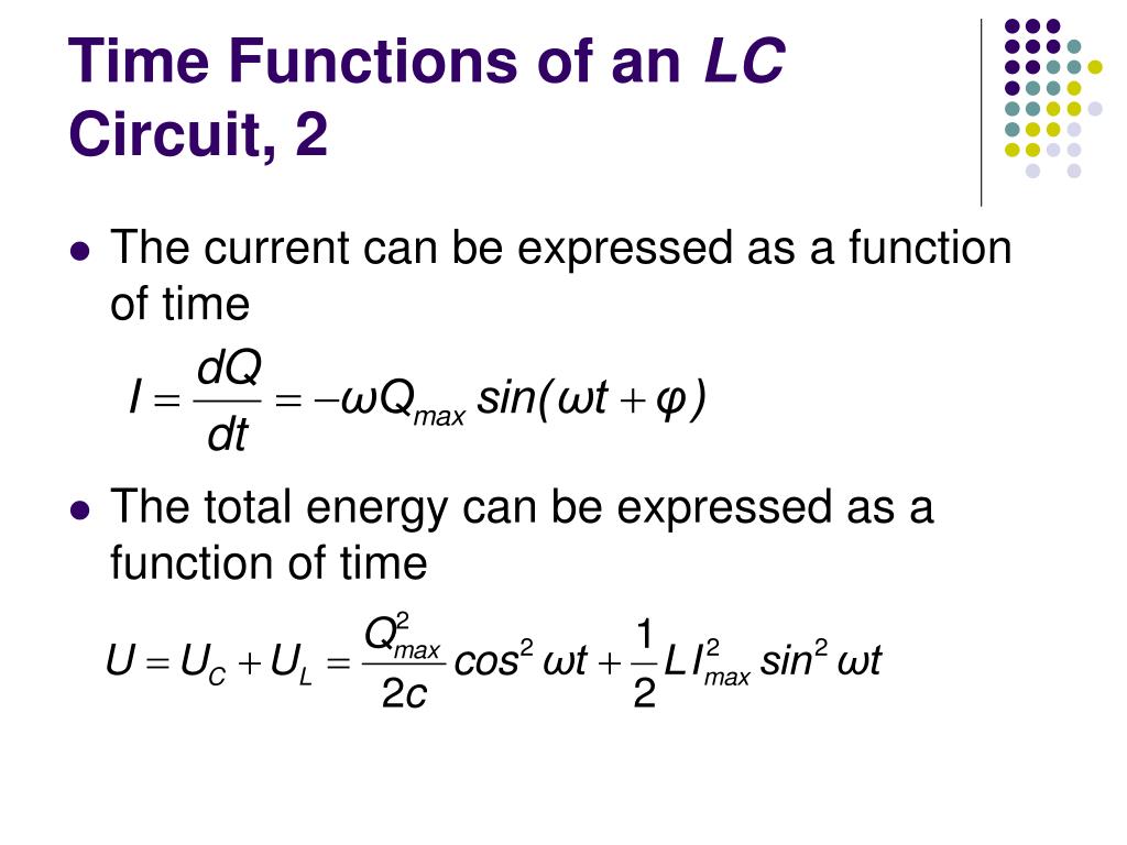 Time Functions of an LC Circuit, 2 • The current can be expressed as a function of time • The total energy can be expressed as a function of time
