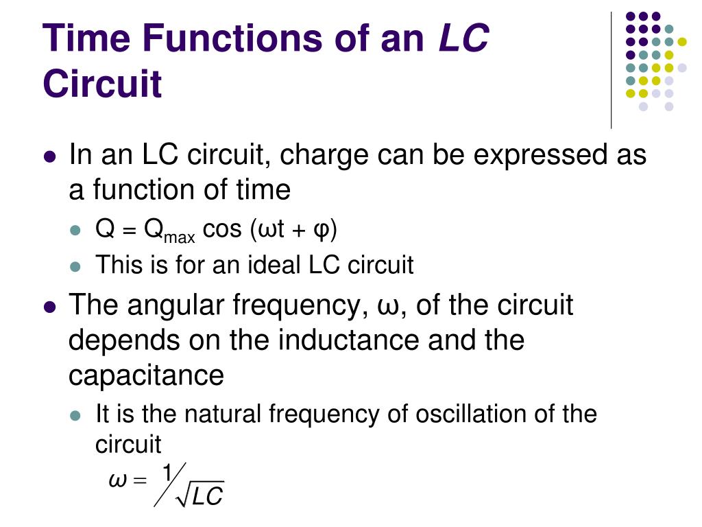 Time Functions of an LC Circuit • In an LC circuit, charge can be expressed as a function of time • Q = Qmax cos (ωt + φ) • This is for an ideal LC circuit • The angular frequency, ω, of the circuit depends on the inductance and the capacitance • It is the natural frequency of oscillation of the circuit