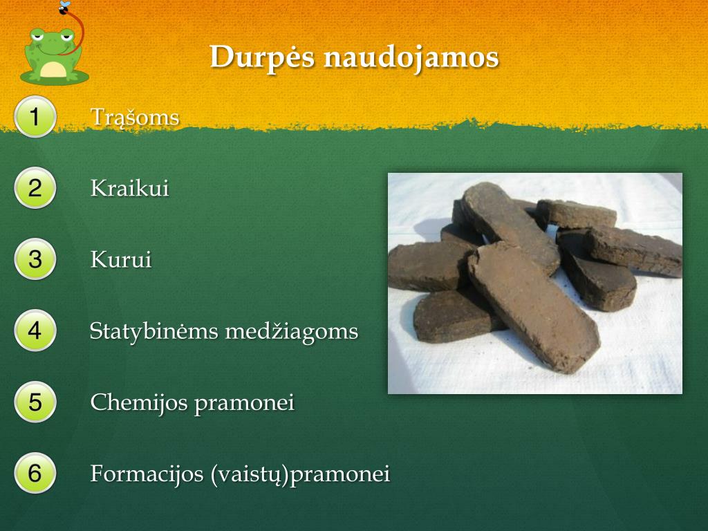 Durpės naudojamos Trąšoms Kraikui Kurui Statybinėms medžiagoms Chemijos pramonei Formacijos (vaistų)pramonei