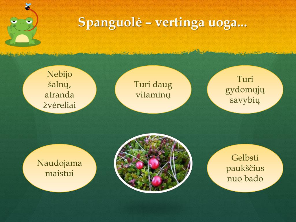 Spanguolė – vertinga uoga... Nebijo šalnų, atranda žvėreliai Turi daug vitaminų Turi gydomųjų savybių Naudojama maistui Gelbsti paukščius nuo bado