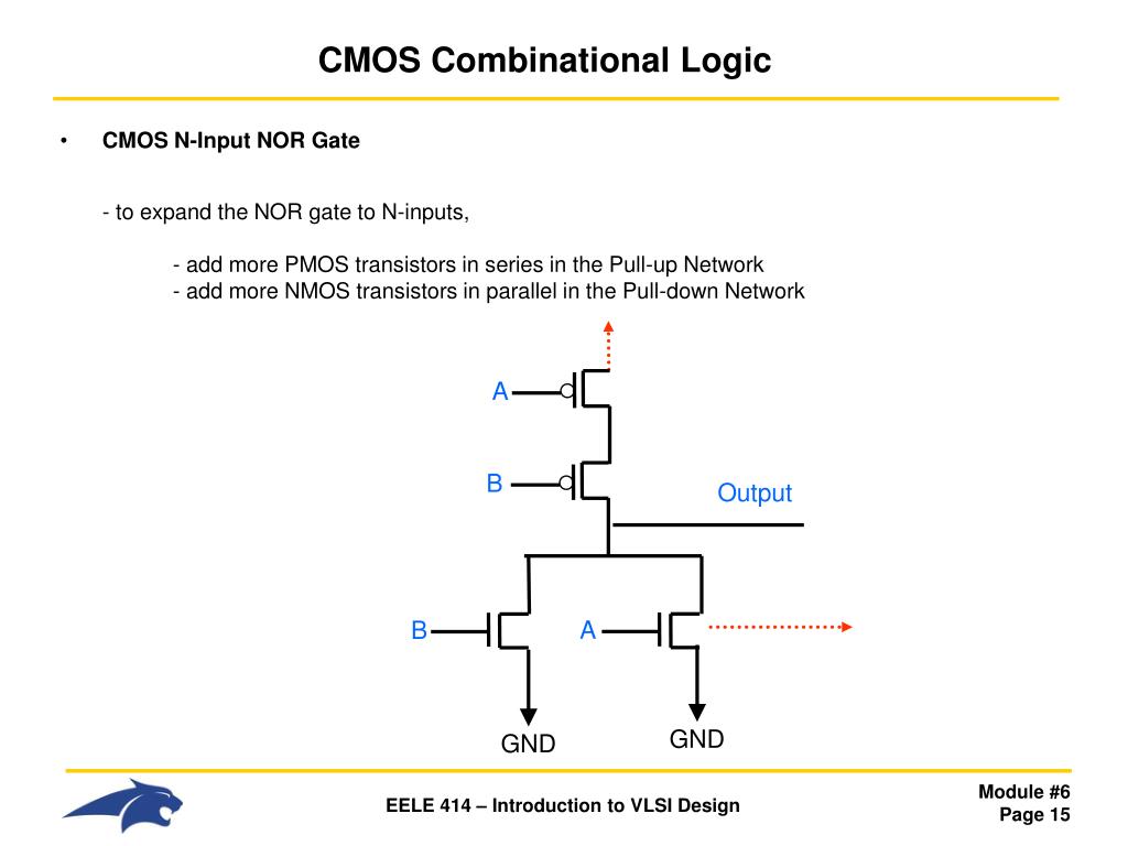 CMOS Combinational Logic • CMOS 2-Input NOR Gate - the transistor level implementation for the NOR gate is:
