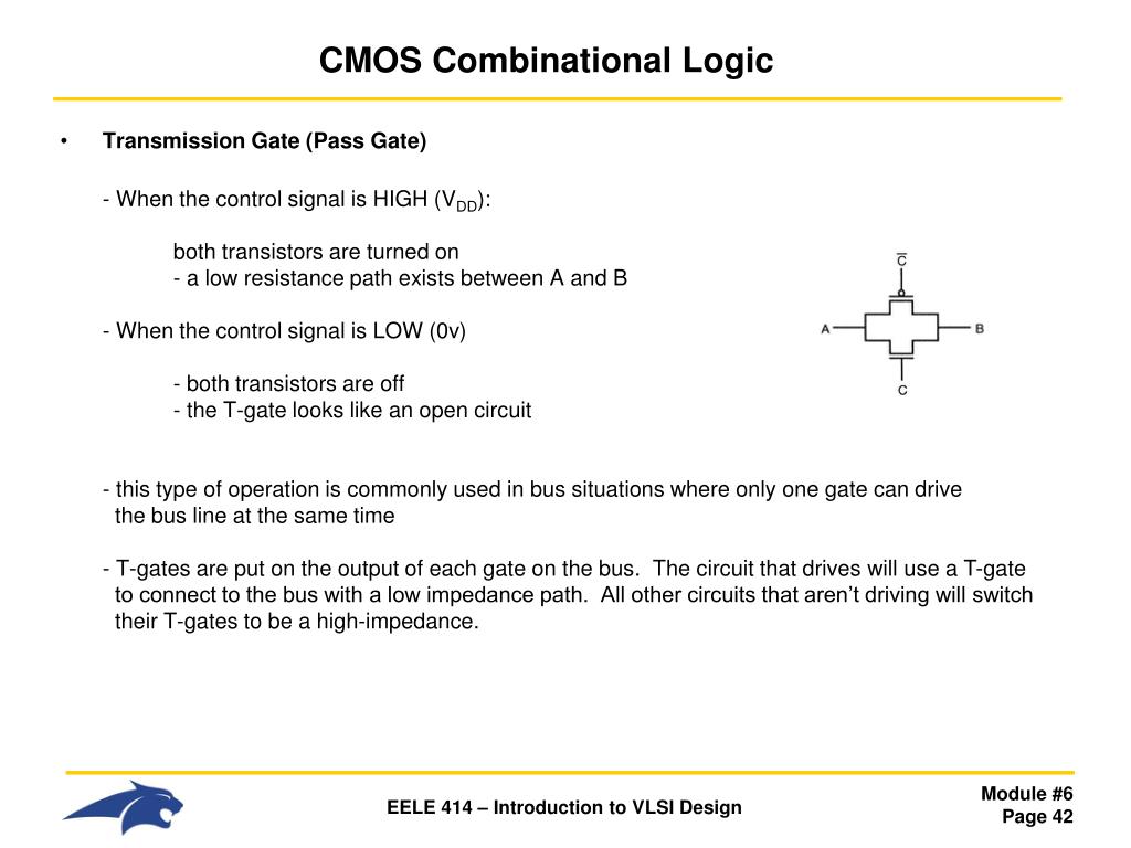 CMOS Combinational Logic • Transmission Gate (Pass Gate) - When the control signal is HIGH (VDD): both transistors are turned on - a low resistance path exists between A and B- When the control signal is LOW (0v) - both transistors are off - the T-gate looks like an open circuit- this type of operation is commonly used in bus situations where only one gate can drive the bus line at the same time- T-gates are put on the output of each gate on the bus. The circuit that drives will use a T-gate to connect to the bus with a low impedance path. All other circuits that aren’t driving will switch their T-gates to be a high-impedance.