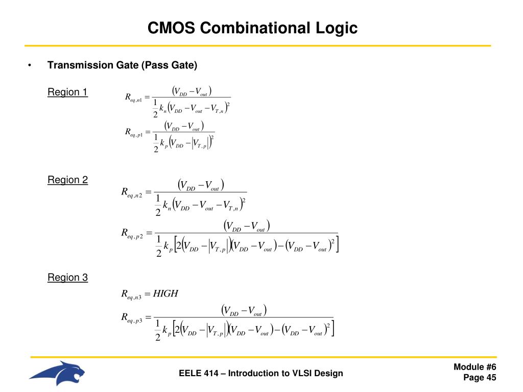 EE 414 – Introduction to VLSI Design. Module #6 – Combinational Logic Agenda Combinational Logic - n-Input Gates & Equivalent Inverter - AOI/OAI Logic Synthesis - Transmission Gates - Layout of Complex Logic Announcements Read Chapter 7. CMOS Combinational Logic.