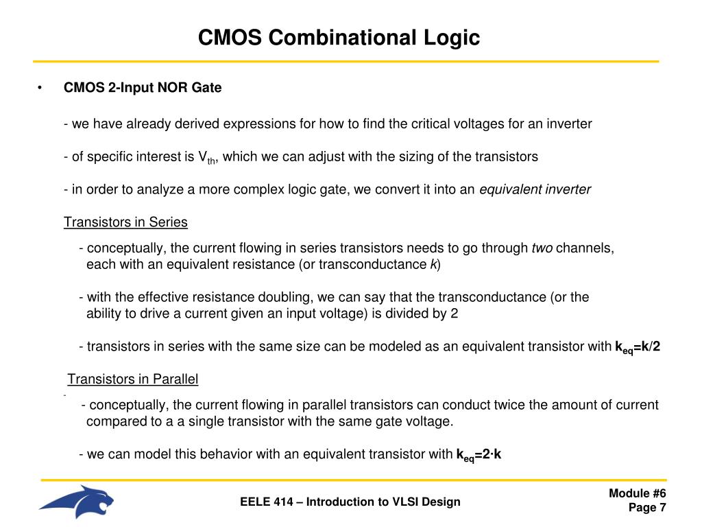 CMOS Combinational Logic • CMOS 2-Input NOR Gate - we have already derived expressions for how to find the critical voltages for an inverter- of specific interest is Vth, which we can adjust with the sizing of the transistors- in order to analyze a more complex logic gate, we convert it into an equivalent inverterTransistors in Series - conceptually, the current flowing in series transistors needs to go through two channels, each with an equivalent resistance (or transconductance k) - with the effective resistance doubling, we can say that the transconductance (or the ability to drive a current given an input voltage) is divided by 2 - transistors in series with the same size can be modeled as an equivalent transistor with keq=k/2Transistors in Parallel- conceptually, the current flowing in parallel transistors can conduct twice the amount of current compared to a a single transistor with the same gate voltage. - we can model this behavior with an equivalent transistor with keq=2∙k