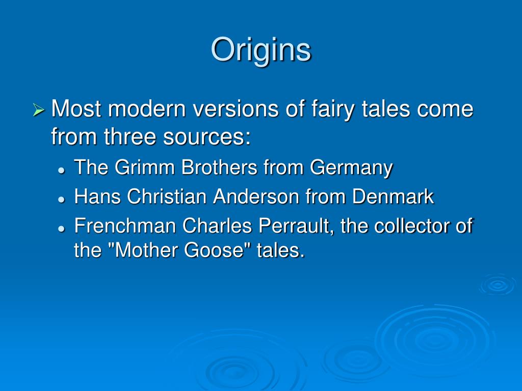 Origins • Most modern versions of fairy tales come from three sources: • The Grimm Brothers from Germany • Hans Christian Anderson from Denmark • Frenchman Charles Perrault, the collector of the "Mother Goose" tales.