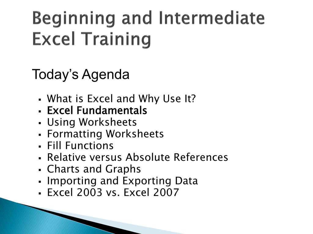Beginning and Intermediate Excel Training Today’s Agenda • What is Excel and Why Use It? • Excel Fundamentals • Using Worksheets • Formatting Worksheets • Fill and Function • Relative versus Absolute References • Charts and Graphs • Importing and Exporting Data • Excel 2003 vs. Excel 2007