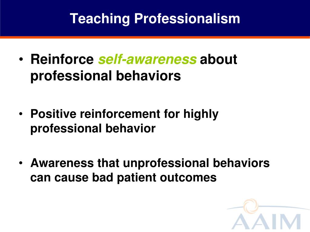 Teaching Professionalism • Reinforce self-awareness about professional behaviors • Positive reinforcement for highly professional behavior • Awareness that unprofessional behaviors can cause bad patient outcomes