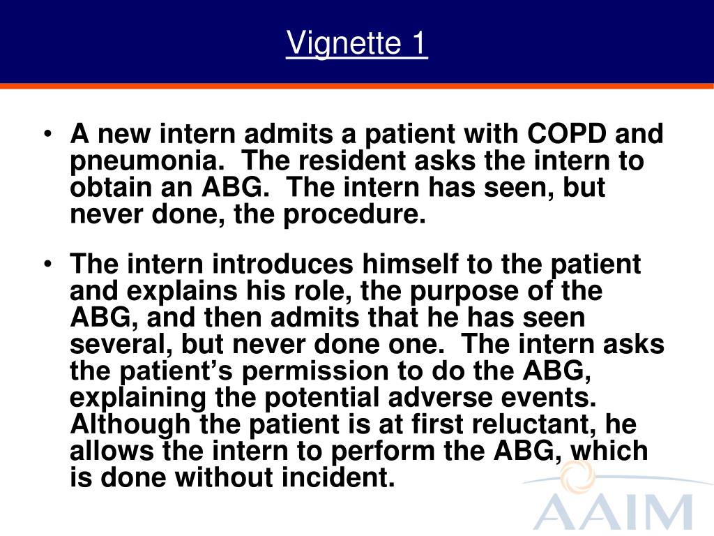 Vignette 1 • A new intern admits a patient with COPD and pneumonia. The resident asks the intern to obtain an ABG. The intern has seen, but never done, the procedure. • The intern introduces himself to the patient and explains his role, the purpose of the ABG, and then admits that he has seen several, but never done one. The intern asks the patient’s permission to do the ABG, explaining the potential adverse events. Although the patient is at first reluctant, he allows the intern to perform the ABG, which is done without incident.