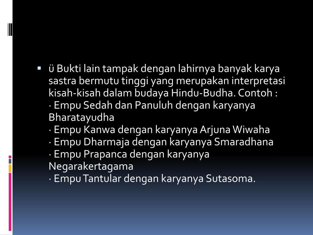 ü Bukti lain tampak dengan lahirnya banyak karya sastra bermutu tinggi yang merupakan interpretasi kisah-kisah dalam budaya Hindu-Budha. Contoh :· Empu Sedah dan Panuluh dengan karyanya Bharatayudha· Empu Kanwa dengan karyanya Arjuna Wiwaha· Empu Dharmaja dengan karyanya Smaradhana· Empu Prapanca dengan karyanya Negarakertagama· Empu Tantular dengan karyanya Sutasoma.