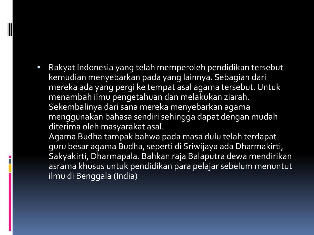 Rakyat Indonesia yang telah memperoleh pendidikan tersebut kemudian menyebarkan pada yang lainnya. Sebagian dari mereka ada yang pergi ke tempat asal agama tersebut. Untuk menambah ilmu pengetahuan dan melakukan ziarah. Sekembalinya dari sana mereka menyebarkan agama menggunakan bahasa sendiri sehingga dapat dengan mudah diterima oleh masyarakat asal.Agama Budha tampak bahwa pada masa dulu telah terdapat guru besar agama Budha, seperti di Sriwijaya ada Dharmakirti, Sakyakirti, Dharmapala. Bahkan raja Balaputra dewa mendirikan asrama khusus untuk pendidikan para pelajar sebelum menuntut ilmu di Benggala (India)