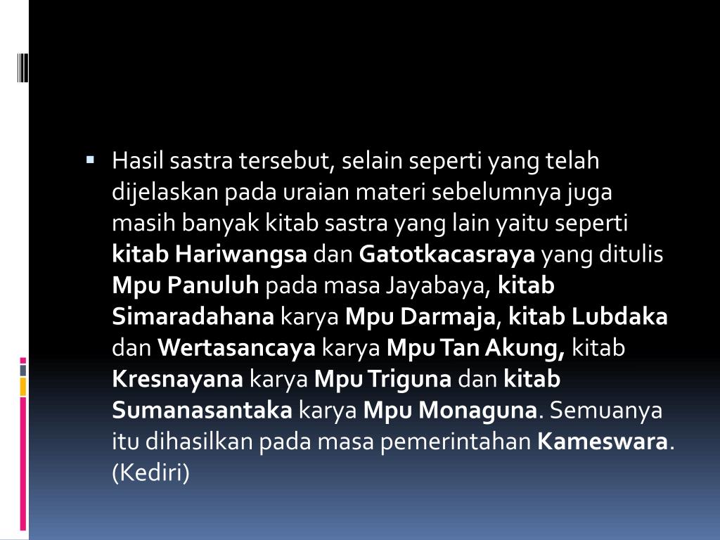 Hasil sastra tersebut, selain seperti yang telah dijelaskan pada uraian materi sebelumnya juga masih banyak kitab sastra yang lain yaitu seperti kitab Hariwangsa dan Gatotkacasraya yang ditulis Mpu Panuluh pada masa Jayabaya, kitab Simaradahana karya Mpu Darmaja, kitab Lubdaka dan Wertasancaya karya Mpu Tan Akung, kitab Kresnayana karya Mpu Triguna dan kitab Sumanasantaka karya Mpu Monaguna. Semuanya itu dihasilkan pada masa pemerintahan Kameswara. (Kediri)