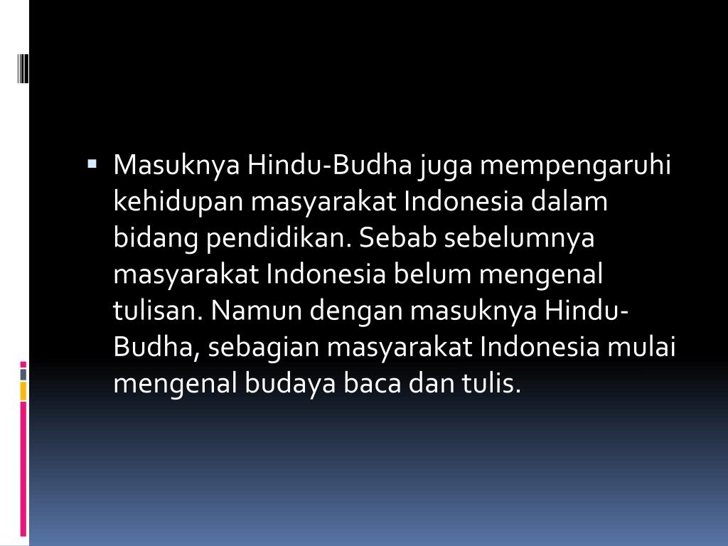 Masuknya Hindu-Budha juga mempengaruhi kehidupan masyarakat Indonesia dalam bidang pendidikan. Sebab sebelumnya masyarakat Indonesia belum mengenal tulisan. Namun dengan masuknya Hindu-Budha, sebagian masyarakat Indonesia mulai mengenal budaya baca dan tulis.