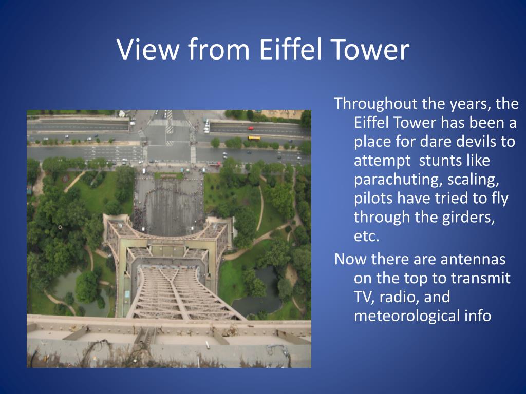 View from Eiffel Tower Throughout the years, the Eiffel Tower has been a place for dare devils to attempt stunts like parachuting, scaling, pilots have tried to fly through the girders, etc. Now there are antennas on the top to transmit TV, radio, and meteorological info
