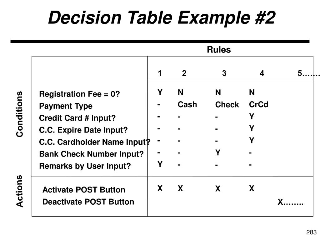 Decision Table Example #2 Rules 1 2 3 4 5……... Y - - - - - Y X N Cash - - - - - X N CrCd Y Y Y - - X N Check - - - Y - X Registration Fee = 0? Payment Type Credit Card # Input? C.C. Expire Date Input? C.C. Cardholder Name Input? Bank Check Number Input? Remarks by User Input? Conditions Activate POST Button Deactivate POST Button Actions X……..