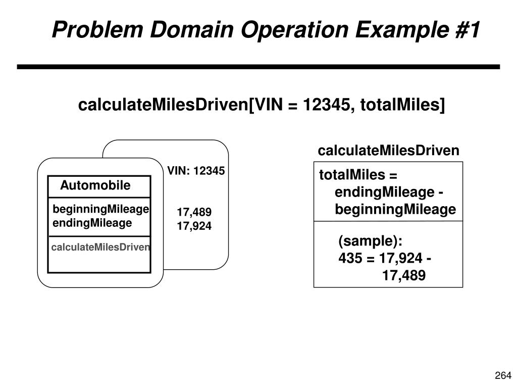 Problem Domain Operation Example #1 calculateMilesDriven[VIN = 12345, totalMiles] calculateMilesDriven VIN: 12345 17,489 17,924 totalMiles = endingMileage - beginningMileage Automobile beginningMileage endingMileage (sample): 435 = 17,924 - 17,489 calculateMilesDriven