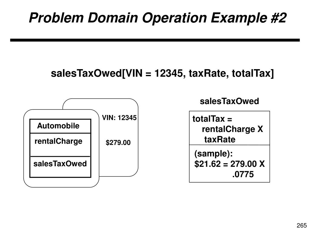 Problem Domain Operation Example #2 salesTaxOwed[VIN = 12345, taxRate, totalTax] salesTaxOwed totalTax = rentalCharge X taxRate VIN: 12345 $279.00 Automobile rentalCharge (sample): $21.62 = 279.00 X .0775 salesTaxOwed
