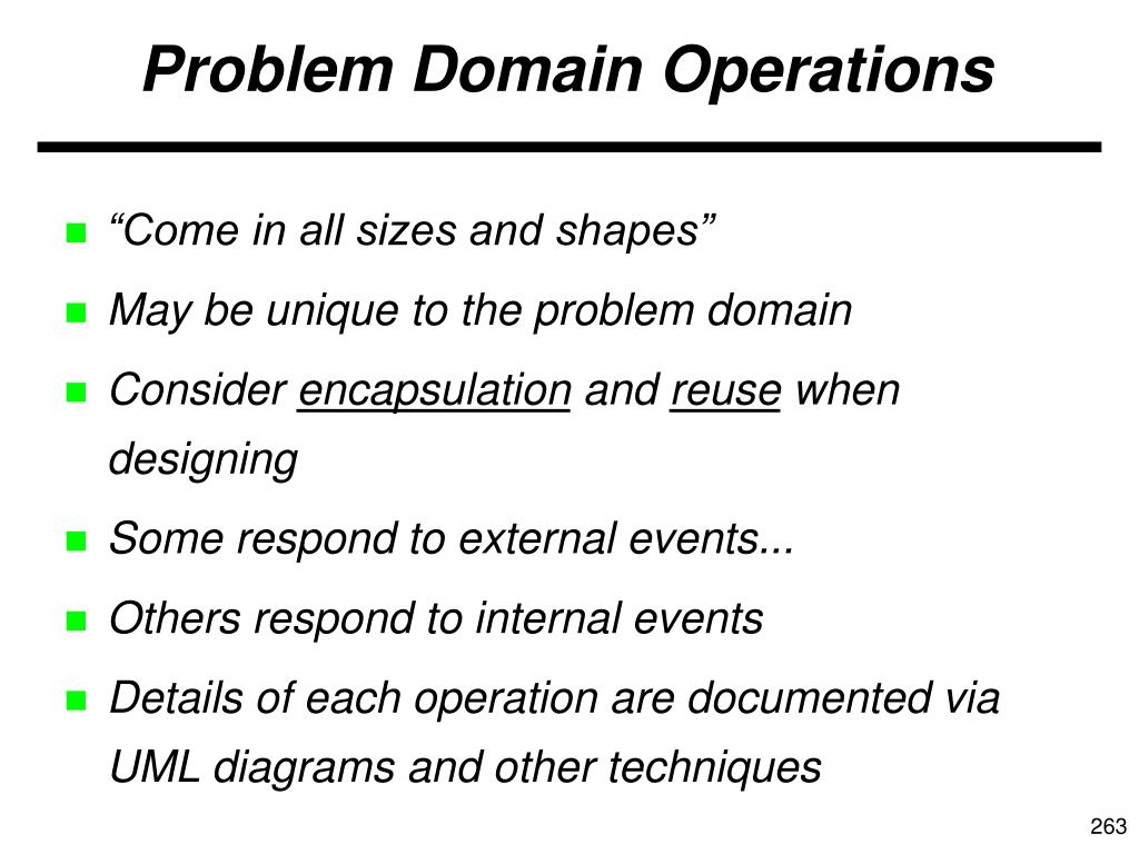Problem Domain Operations • “Come in all sizes and shapes” • May be unique to the problem domain • Consider encapsulation and reuse when designing • Some respond to external events... • Others respond to internal events • Details of each operation are documented via UML diagrams and other techniques