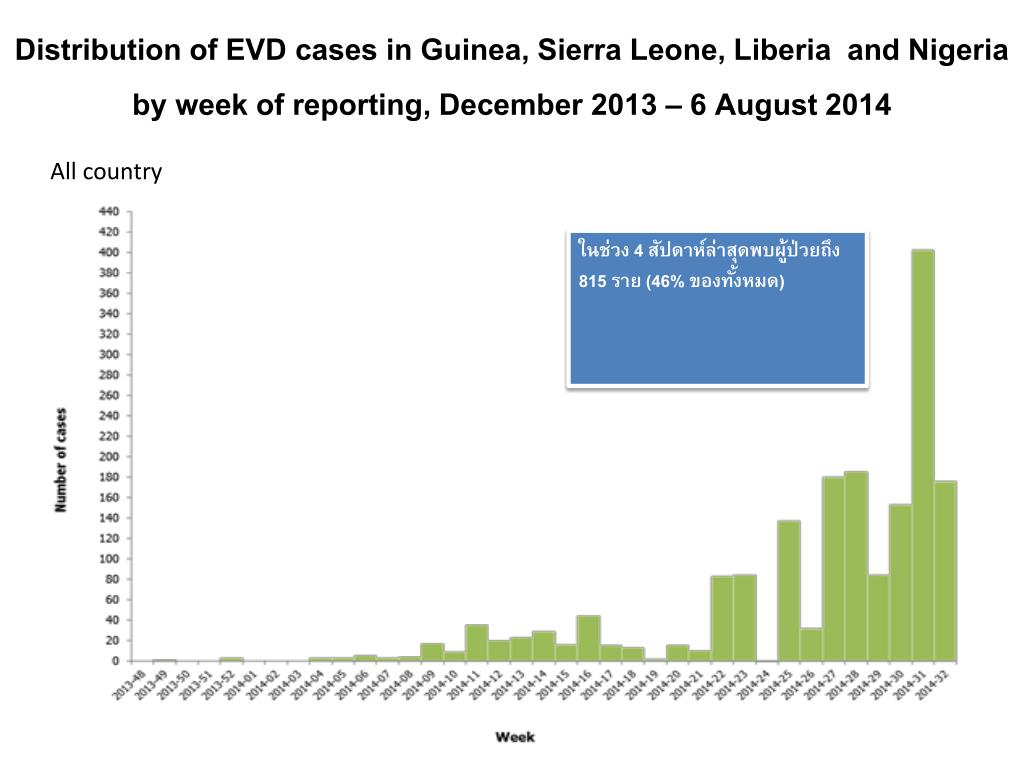 Distribution of EVD cases in Guinea, Sierra Leone, Liberia and Nigeria by week of reporting, December 2013 – 6 August 2014 All country ในช่วง 4 สัปดาห์ล่าสุดพบผู้ป่วยถึง 815 ราย (46% ของทั้งหมด)