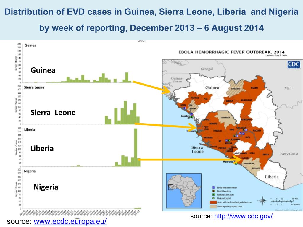 Distribution of EVD cases in Guinea, Sierra Leone, Liberia and Nigeria by week of reporting, December 2013 – 6 August 2014 Guinea Sierra Leone Liberia Nigeria source: http://www.cdc.gov/ source: www.ecdc.europa.eu/