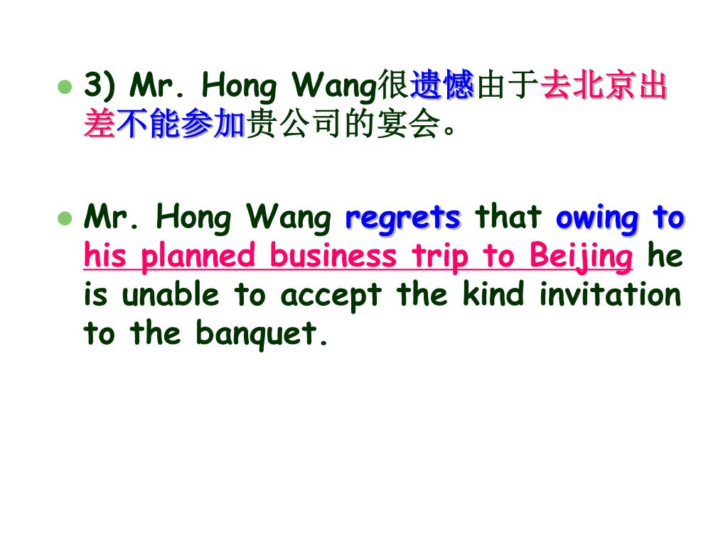 3) Mr. Hong Wang很遗憾由于去北京出差不能参加贵公司的宴会。 • Mr. Hong Wang regrets that owing tohis planned business trip to Beijing he is unable to accept the kind invitation to the banquet.
