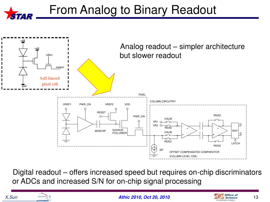 From Analog to Binary Readout Analog readout – simpler architecture but slower readout Digital readout – offers increased speed but requires on-chip discriminators or ADCs and increased S/N for on-chip signal processing