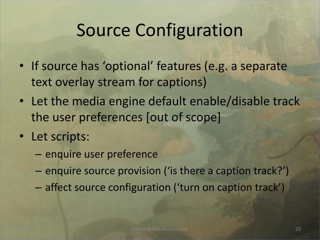 Source Configuration • If source has ‘optional’ features (e.g. a separate text overlay stream for captions) • Let the media engine default enable/disable track the user preferences [out of scope] • Let scripts: • enquire user preference • enquire source provision (‘is there a caption track?’) • affect source configuration (‘turn on caption track’) Timed Media Accessibility