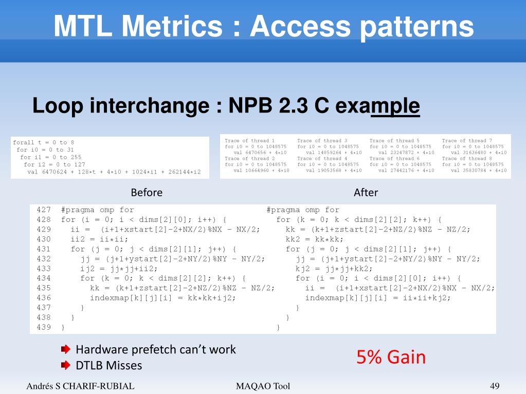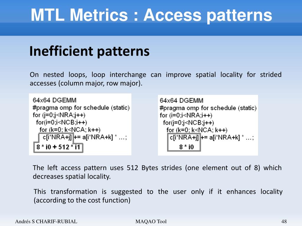 MTL Metrics : Access patterns Inefficient patterns On nested loops, loop interchange can improve spatial locality for strided accesses (column major, row major). The left access pattern uses 512 Bytes strides (one element out of 8) which decreases spatial locality. This transformation is suggested to the user only if it enhances locality (according to the cost function) MAQAO Tool