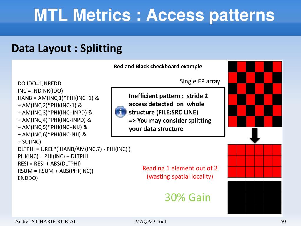 MTL Metrics : Access patterns Data Layout : Splitting Single FP array Red and Black checkboard example DO IDO=1,NREDD INC = INDINR(IDO) HANB = AM(INC,1)*PHI(INC+1) & + AM(INC,2)*PHI(INC-1) & + AM(INC,3)*PHI(INC+INPD) & + AM(INC,4)*PHI(INC-INPD) & + AM(INC,5)*PHI(INC+NIJ) & + AM(INC,6)*PHI(INC-NIJ) & + SU(INC) DLTPHI = UREL*( HANB/AM(INC,7) - PHI(INC) ) PHI(INC) = PHI(INC) + DLTPHI RESI = RESI + ABS(DLTPHI) RSUM = RSUM + ABS(PHI(INC)) ENDDO) Inefficient pattern : stride 2 accessdetected on wholestructure (FILE:SRC LINE) => You mayconsidersplittingyour data structure Reading 1 element out of 2 (wasting spatial locality) 30% Gain MAQAO Tool