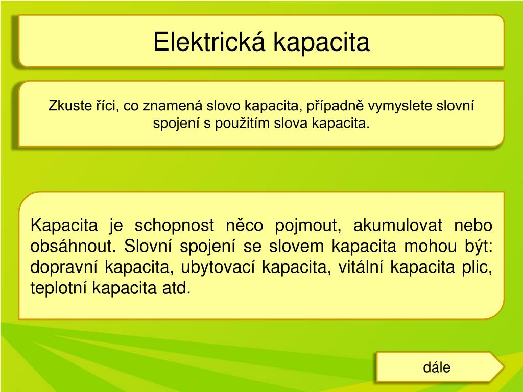 Elektrická kapacita Zkuste říci, co znamená slovo kapacita, případně vymyslete slovní spojení s použitím slova kapacita. Kapacita je schopnost něco pojmout, akumulovat nebo obsáhnout. Slovní spojení se slovem kapacita mohou být: dopravní kapacita, ubytovací kapacita, vitální kapacita plic, teplotní kapacita atd. Odpověď dále