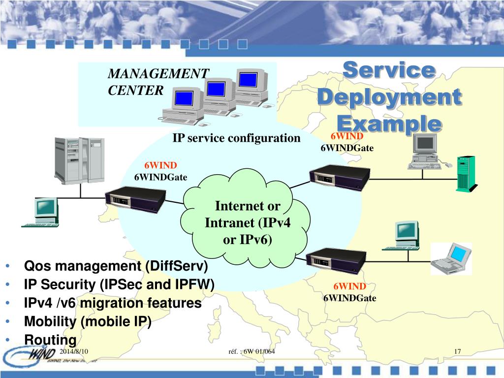 MANAGEMENT CENTER IP service configuration 6WIND 6WINDGate 6WIND 6WINDGate 6WIND 6WINDGate Service Deployment Example • Qos management (DiffServ) • IP Security (IPSec and IPFW) • IPv4 /v6 migration features • Mobility (mobile IP) • Routing Internet or Intranet (IPv4 or IPv6) réf. : 6W 01/064