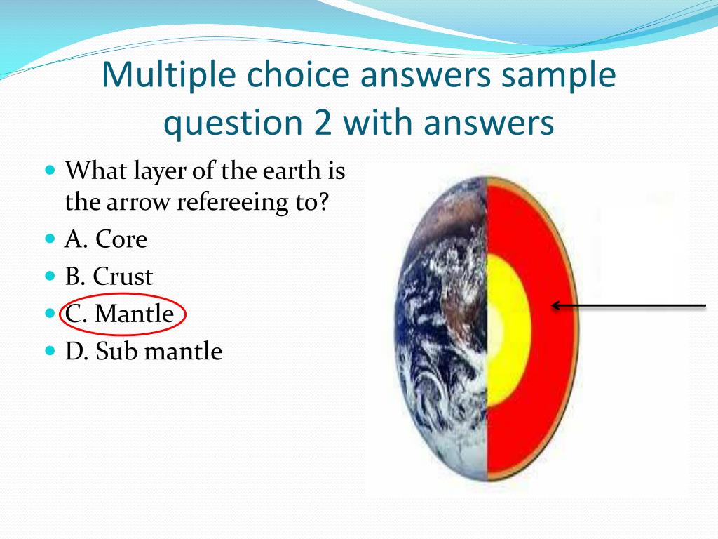 Multiple choice answers sample question 2 with answers • What layer of the earth is the arrow refereeing to? • A. Core • B. Crust • C. Mantle • D. Sub mantle