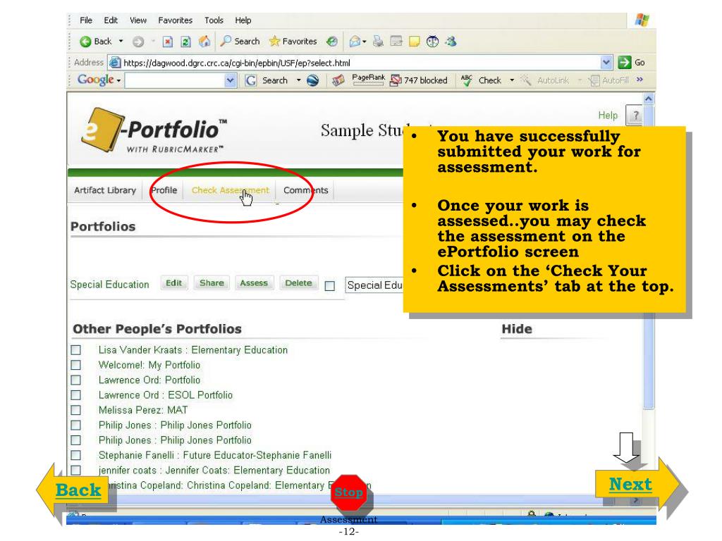Next Back • You have successfully submitted your work for assessment. • Once your work is assessed..you may check the assessment on the ePortfolio screen • Click on the ‘Check Your Assessments’ tab at the top. Stop Assessment -12-
