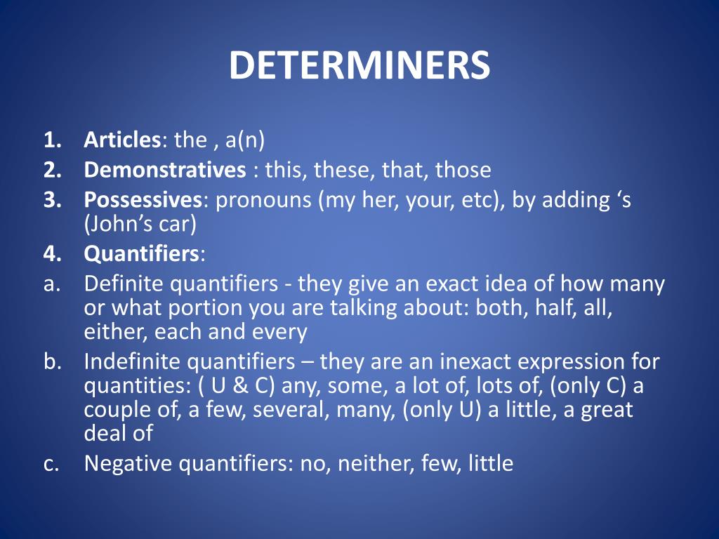 DETERMINERS • Articles: the , a(n) • Demonstratives : this, these, that, those • Possessives: pronouns (my her, your, etc), by adding ‘s (John’s car) • Quantifiers: • Definite quantifiers - they give an exact idea of how many or what portion you are talking about: both, half, all, either, each and every • Indefinite quantifiers – they are an inexact expression for quantities: ( U & C) any, some, a lot of, lots of, (only C) a couple of, a few, several, many, (only U) a little, a great deal of • Negative quantifiers: no, neither, few, little
