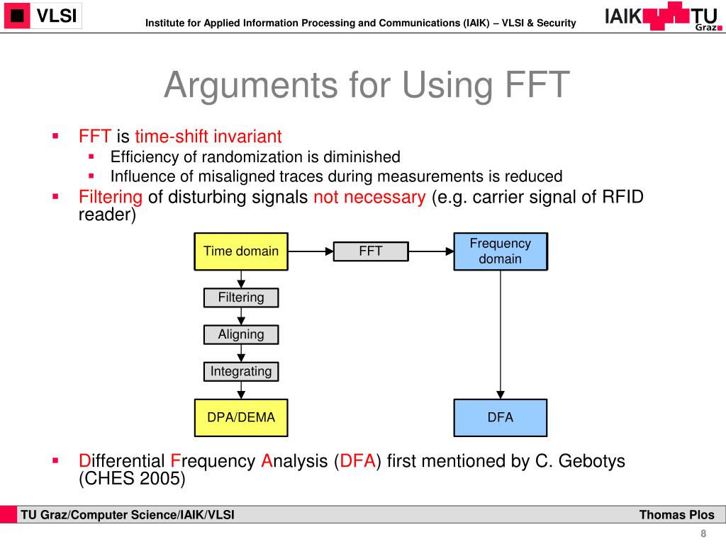 Arguments for Using FFT FFT is time-shift invariant Efficiency of randomization is diminished Influence of misaligned traces during measurements is reduced Filtering of disturbing signals not necessary (e.g. carrier signal of RFID reader) Differential Frequency Analysis (DFA) first mentioned by C. Gebotys (CHES 2005)