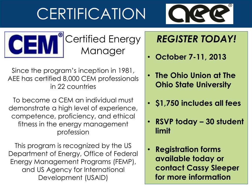 CERTIFICATION Since the program’s inception in 1981, AEE has certified 8,000 CEM professionals in 22 countries To become a CEM an individual must demonstrate a high level of experience, competence, proficiency, and ethical fitness in the energy management profession This program is recognized by the US Department of Energy, Office of Federal Energy Management Programs (FEMP), and US Agency for International Development (USAID) • REGISTER TODAY! • October 7-11, 2013 • The Ohio Union at The Ohio State University • $1,750 includes all fees • RSVP today – 30 student limit • Registration forms available today or contact Cassy Sleeper for more information Certified Energy Manager