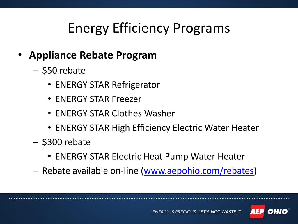 Energy Efficiency Programs • Appliance Rebate Program • $50 rebate • ENERGY STAR Refrigerator • ENERGY STAR Freezer • ENERGY STAR Clothes Washer • ENERGY STAR High Efficiency Electric Water Heater • $300 rebate • ENERGY STAR Electric Heat Pump Water Heater • Rebate available on-line (www.aepohio.com/rebates)