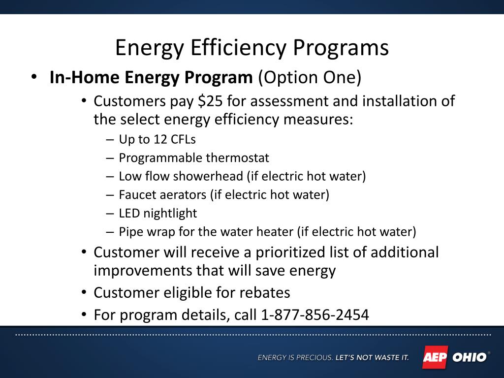 Energy Efficiency Programs • In-Home Energy Program (Option One) • Customers pay $25 for assessment and installation of the select energy efficiency measures: • Up to 12 CFLs • Programmable thermostat • Low flow showerhead (if electric hot water) • Faucet aerators (if electric hot water) • LED nightlight • Pipe wrap for the water heater (if electric hot water) • Customer will receive a prioritized list of additional improvements that will save energy • Customer eligible for rebates • For program details, call 1-877-856-2454