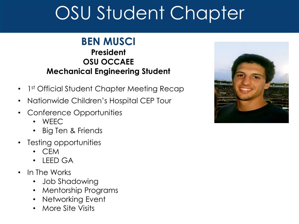 OSU Student Chapter BEN MUSCI President OSU OCCAEE Mechanical Engineering Student • 1st Official Student Chapter Meeting Recap • Nationwide Children’s Hospital CEP Tour • Conference Opportunities • WEEC • Big Ten & Friends • Testing opportunities • CEM • LEED GA • In The Works • Job Shadowing • Mentorship Programs • Networking Event • More Site Visits