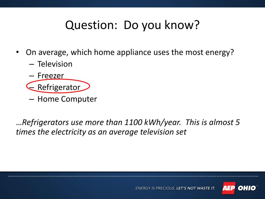 Question: Do you know? • On average, which home appliance uses the most energy? • Television • Freezer • Refrigerator • Home Computer …Refrigerators use more than 1100 kWh/year. This is almost 5 times the electricity as an average television set