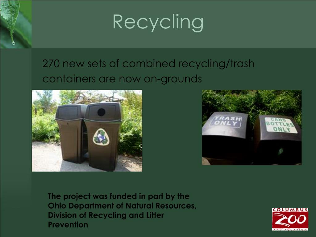 Recycling 270 new sets of combined recycling/trash containers are now on-grounds The project was funded in part by the Ohio Department of Natural Resources, Division of Recycling and Litter Prevention