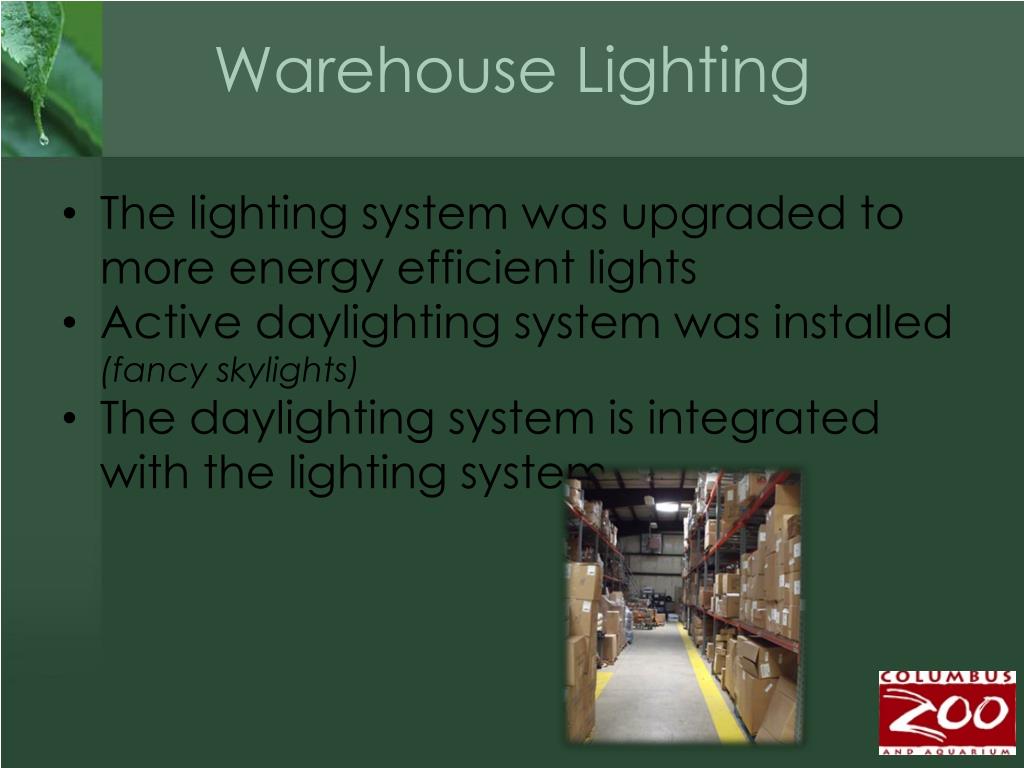 Warehouse Lighting The lights are connected to occupancy sensors The Zoo has seen a savings of $11,000 per year on its electric bill The estimated ROI on this project was 2.4 years