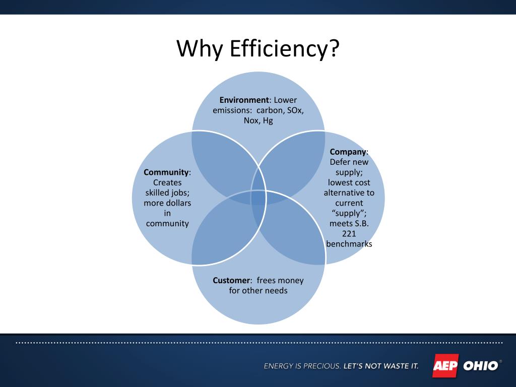 Energy Efficiency Programs • Online Energy Checkup (Free) • Customer completes step-by-step profile of their home • Report shows how home uses energy and ways to save • Customer receives free energy efficiency measures: • 5 CFLs and LED nightlight • Depending on how home is heated, cooled and how water is heated: • Low flow showerhead, faucet aerators, pipe wrap for the water heater • Weather-strip, draft stoppers • Customer eligible for rebates • Find at aepohio.com/rebates