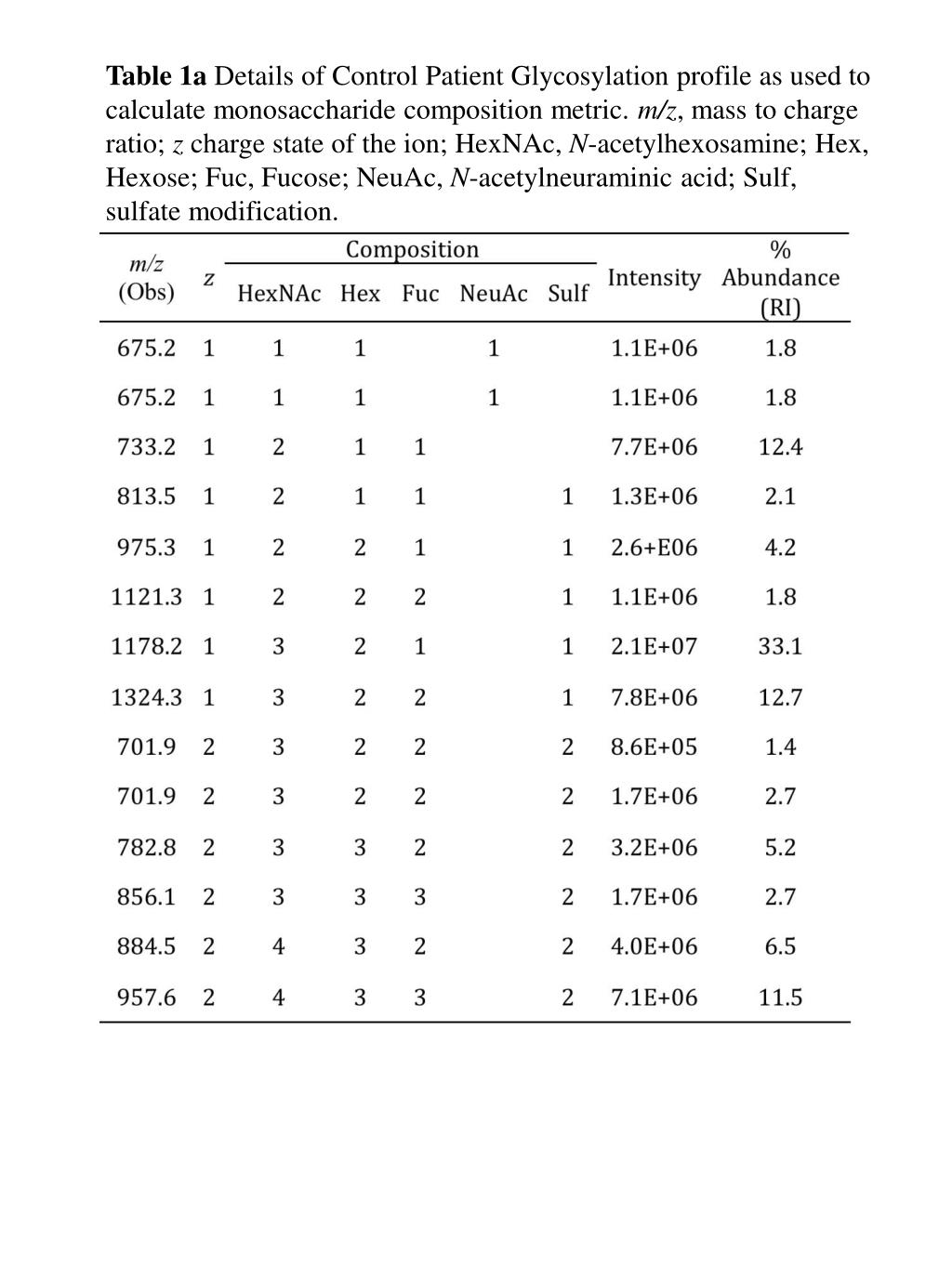 Table 1a Details of Control Patient Glycosylation profile as used to calculate monosaccharide composition metric. m/z, mass to charge ratio; z charge state of the ion; HexNAc, N-acetylhexosamine; Hex, Hexose; Fuc, Fucose; NeuAc, N-acetylneuraminic acid; Sulf, sulfate modification.
