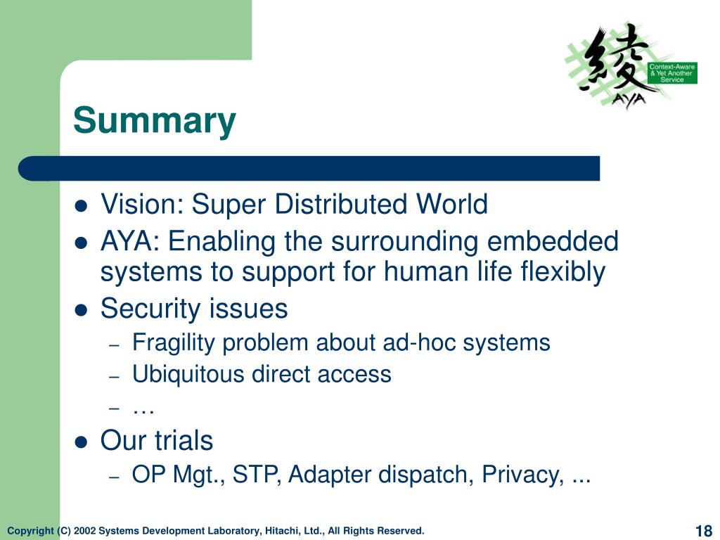Summary • Vision: Super Distributed World • AYA: Enabling the surrounding embedded systems to support for human life flexibly • Security issues • Fragility problem about ad-hoc systems • Ubiquitous direct access • … • Our trials • OP Mgt., STP, Adapter dispatch, Privacy, ...